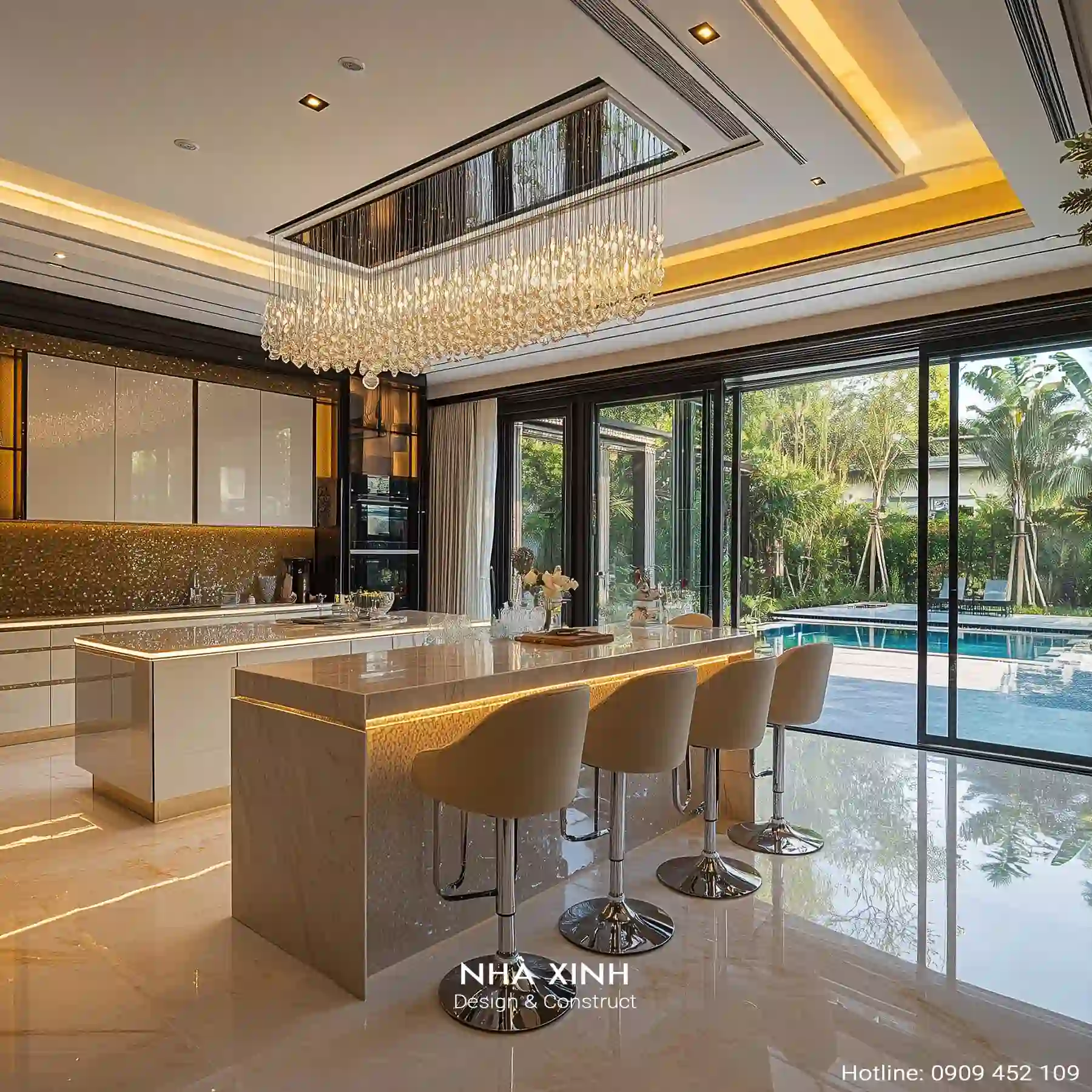 Khu vực bếp được trang trí đẹp mắt với đèn led nhìn ra hồ bơi