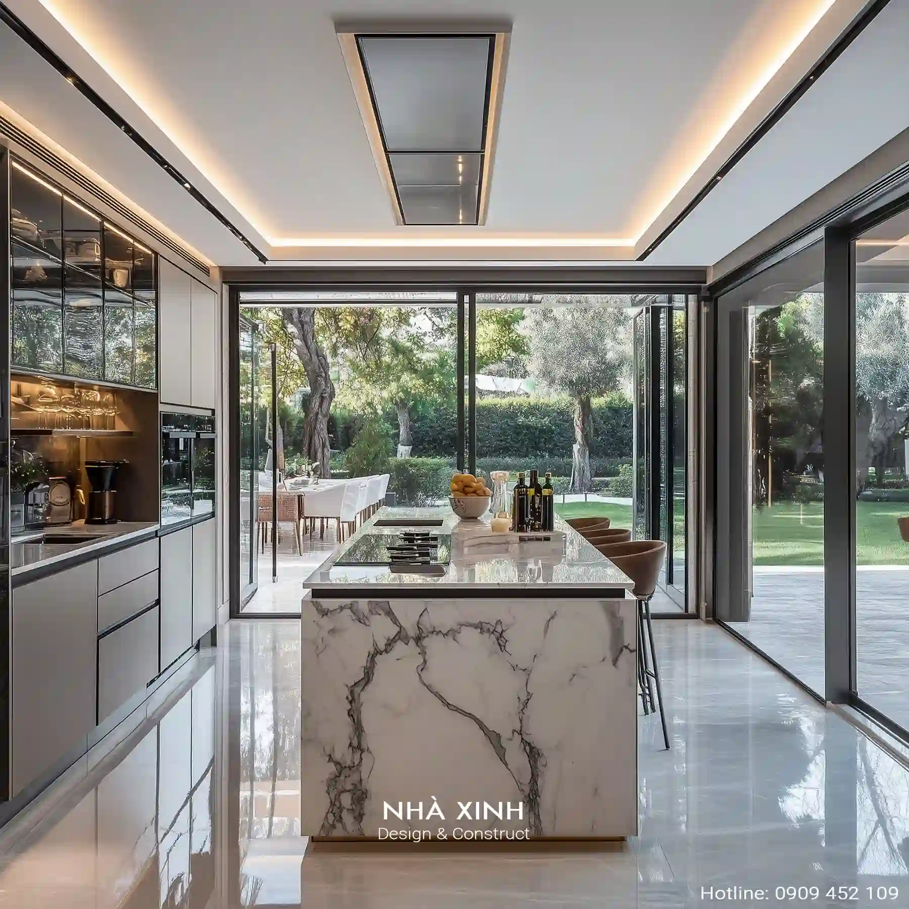 Không gian nội thất phòng bếp được trang bị hiện đại, sử dụng các vật liệu cao cấp, tiện nghi đầy đủ phục vụ cho sinh hoạt. Thiết kế không gian mở đi thẳng ra sân vườn vừa tiện lợi vừa mang đến sự thoáng đãng, rộng rãi.